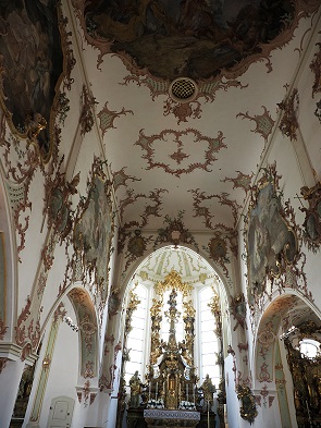 Der Innenraum liegt deutlich unterhalb vom Straßenniveau. Dementsprechend ist die Ausleuchtung des Mittelschiffs verhältnismäßig schlecht, denn das Licht fällt hier nur vom großen Westfenster und von den Chorfenstern herein, so kommen Stuck und Fresken wesentlich schlechter zur Geltung als in einem vergleichbaren, lichten Rokokosaal.