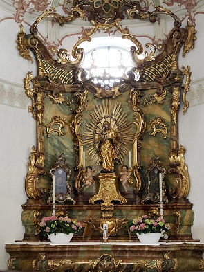 Zentrum der Kirche ist der Rokoko-Hochaltar, der sich wunderbar in den Kirchenraum einfügt, oben befindet sich die Figur des Kirchenpatrons St. Kassian. Er ist eine Rekonstruktion des 1759 von Johann Baptist Dirr geschaffenen und 1864 zerstörten Altares, den im Jahr 1908 der Bildhauer Jakob Helmer fertigte. Rechts und links stehen zwei barocke Seitenaltäre.