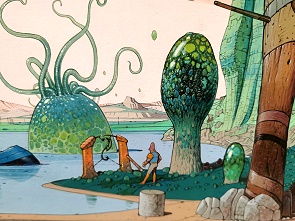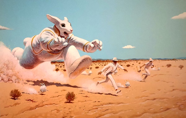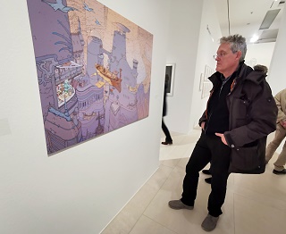 Die mit visionären Bildwelten des Künstlers, die teils mit surrealistische Techniken entstanden, nehmen einen sofort gefangen. Man sieht Wüstenlandschaften, futuristische Metropolen und Reisen durch Raum und Zeit. Selbst da, wo es an Figuren nur so wimmelt, strahlen die Bilder eine unglaubliche Ruhe aus. Das Wandern zwischen den Welten, das Fliegen und Fallen durch Zeit und Raum sind zentrale Motive im Werk. Es gibt kolorierte Zeichnungen, szenisch gegliederte Comicfolgen, Skizzen, abstrakte Gemälde bis hin zu Druckgrafiken.