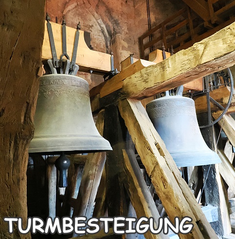 Bei Gegenverkehr wird es eng auf der Treppe, und wenn man oben angekommen ist, brennen die Muskeln. Unterwegs kommt man am mechanischen Uhrwerk und am Glockenstuhl mit dem Dreiergeläut von 1518 vorbei – eine willkommene Unterbrechung beim Aufstieg, um Luft zu holen und ggf. ausweichen zu können. Aber der Aufstieg lohnt sich auf jeden Fall.