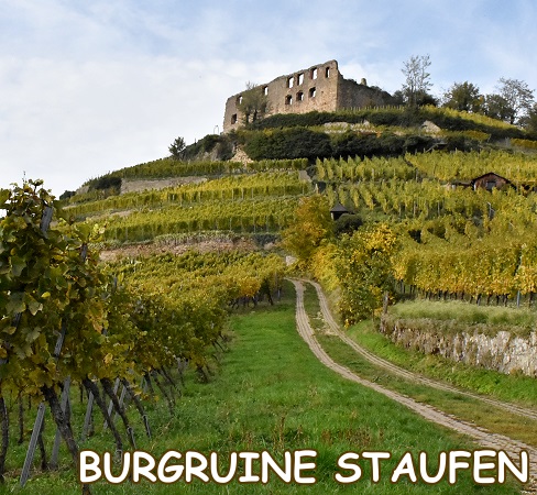 Die Burgruine Staufen erhebt sich auf einem markanten, erdbedeckten Kalksteinkegel am Ausgang des Münstertales. So parkten wir auf einem Platz unterhalb neben der Altstadt und liefen zu Fuß hoch zu den malerischen Ruinen. Funde und Ausgrabungen haben bewiesen, dass hier auf dem Hügel an der Stelle der heutigen Burgruine bereits in der Römerzeit ein Wachturm stand.