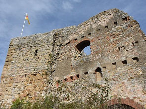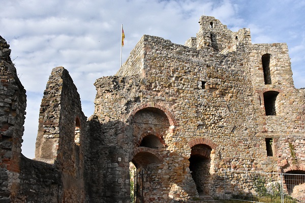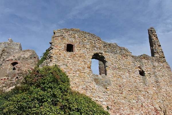 In der Kernburg lag ein erster Palas direkt am Bergfried, hier kann man noch die Reste einer Innenwand sehen. Es gab wohl noch einen zweiten, jüngeren Palas, bevor im 15. oder 16. Jh. der jetzige Palas im Süden erbaut wurde. Heute wohnen hier auf einer Seite der Anlage wohl eher seltene Pflanzen oder Eidechsen, ein Teil des Innenhofs war bei unserem Besuch aus Naturschutzgründen abgesperrt.