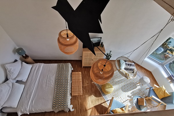 Auf einer Empore, die man über eine Leiter neben dem Bett erreicht, befindet sich eine gemütlich eingerichtete Lounge zum Abhängen oder Lesen. Sie kann auch als Schlafgelegenheit für ein Kind genutzt werden kann.