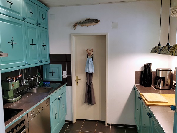 Auch die schöne Küche mit türkisen Schränken bietet nicht nur Geräte wie Induktionsherd, Kühlschrank mit Gefrierfach, Backofen, Geschirrspüler, Toaster, Stabmixer und Handmixer. Es gibt hier gleich drei Möglichkeiten seinen Kaffee zuzubereiten: eine Kaffeemaschine mit Filter, eine professionelle Espresso-Maschine und einen Kaffeebereiter von Bodum. Dazu natürlich Kaffeefilter, Kaffeepulver und Zucker. Sogar ein Wassersprudler steht in der Küche.