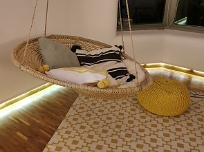 Der Wohn- und Schlafraum ist offen gestaltet, ein südwestlich ausgerichtetes Panoramafenster bietet einen schönen Ausblick in das beschauliche kleine Tal und ins Grüne. An der Decke hängt ein Schaukelsessel mit Schaffell, von dem aus man den Blick genießen kann. Es gibt eine Essecke, ein großes Boxspring-Doppelbett (180cm x 200cm) und einen Schrank mit Gesellschaftsspielen und Büchern im Inneren und einem Fernseher drauf.