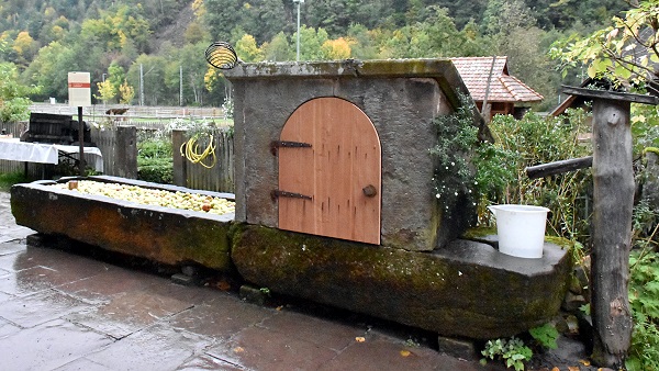 Ein anderes kulinarisches Highlight befand sich vor dem Lorenzenhof, hier werden Äpfel der Apfelbäume auf dem Gelände zunächst im Brunnentrog gewaschen. Im Anschluss werden sie gemahlen und schließlich in der Obstpresse ausgepresst. Der frisch gepresste Apfelsaft aus der Trotte darf dann direkt von den Museumsgästen verkostet werden.