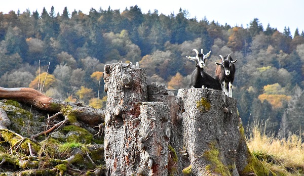 Ziemlich früh, noch vor Mittag, kamen wir an. Nur zwei Autos standen auf dem Parkplatz und wir wanderten bei schönstem Wetter los, einmal rund um den See. Das Restaurant Fischerhütte am Wegrand hatte noch nicht geöffnet und am Wegrand grasten einige Ziegen in einem Gehege, sie lagen malerisch auf abgesägten Baumstümpfen. Auch einige Eichelhäher konnten wir entdecken und Greifvögel zogen am Himmel ihre Kreise.