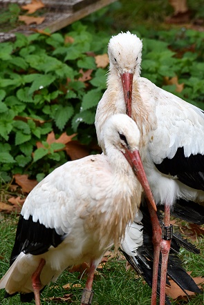 Natürlich gibt es in einem Vogelpark auch Vögel zu sehen. Hier sind es unter anderem Enten, Kokaburras, Marabus, Kakadus, Kraniche, Edelpapageien, Sonnensittiche, Ziegensittiche, Flamingos, Tauben, Schwäne, Perlhühner, Gänse, Wellensittiche, Nympfensittiche, normale und weiße Pfaue, ein paar Greifvögel, ein paar Aras, Graupapageien und einige Eulen. Störche gibt es im Park auch und sie sind ebenfalls auf den Wiesen rund um Steinen zu beobachten.