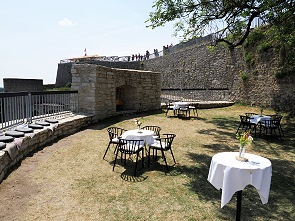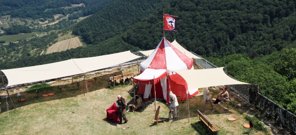 Aus Versehen stolperten wir vom Innenhof auf eine Gartenterrasse, auf der später eine Flugschau mit Greifvögeln stattfinden sollte. Bei schönem Wetter kommt Sonn- und Feiertags jeweils um 12:00, 14:00 und 16:00 Uhr Falkner Wolfgang Weller mit seiner Falken-Show auf die Burg.
