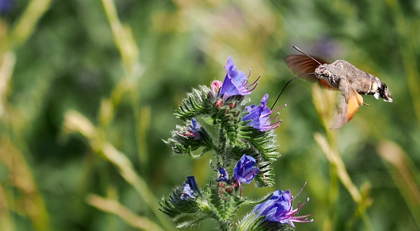 Uns haben die üppig blühenden lila Natterkopf-Blumen begeistert, denn hier schwirrten Rostfarbige Dickkopffalter, Bienen, Hummeln und Taubenschwänzchen herum. Lange hat man es in der prallen Sonne zwischen den windstillen Mauern stehend nicht ausgehalten.