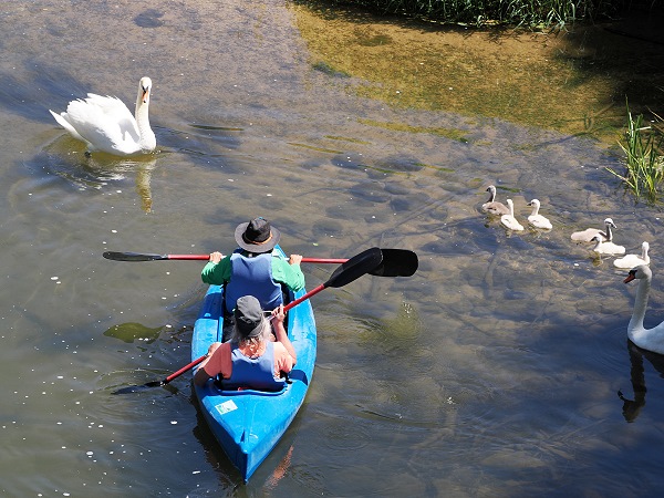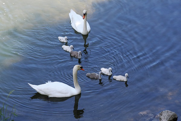 Jetzt im Juni konnten wir noch einige Kanufahrer vom Balkon aus beobachten, ebenso die hier vorbeikommenden Wasservögel. Egal ob Blesshühner, Graureiher oder Schwäne mit ihren Kleinen, das Donauwehr zog sie alle an.