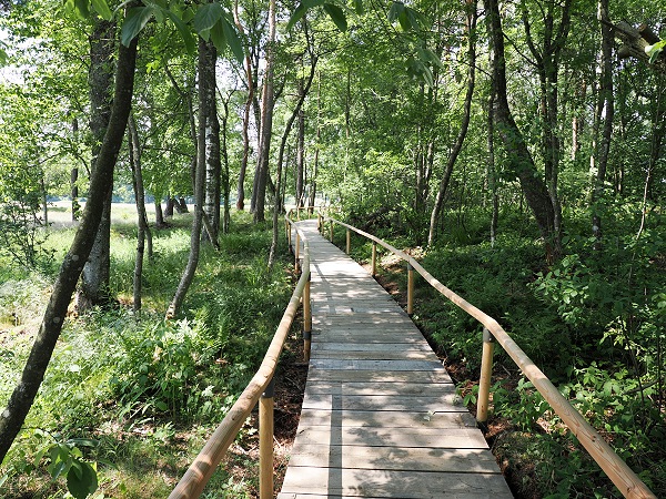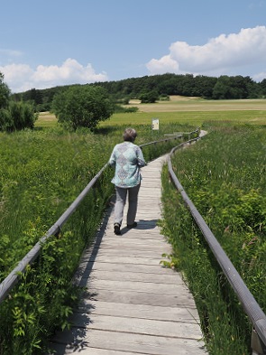 Direkt nebenan beginnt nach einigen Metern Straße rechts ab der Bohlenweg ins Moor, von dem aus die besondere Pflanzen- und Tierwelt beobachtet werden kann, ohne dass Besucher die trittempfindliche Vegetation schädigen. Die Landschaft hier ist teilweise offen, teilweise verbuscht oder bewaldet. Für die verkarstete Albhochfläche sind das hier jedenfalls völlig untypische Vegetationsformen mit Pfeifengraswiesen, Großseggen- und Kleinseggenriede, Streuwiesen und Heidelbeer-Kiefern-Wald.