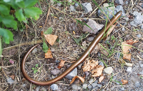Nach dem Essen fuhren wir weiter, von der Wallenburg zur ca. 14 Kilometer entfernten Ruine Hallenburg. Nach 20 Minuten Fahrt parkten wir etwas unterhalb im Ort Steinbach-Hallenberg und liefen über den "Schlossgarten" hoch zur Burgruine. Der Weg führt vorbei an Wiesen und Wochenendehäusern mit schönen Gärten. Hier haben wir sogar eine Blindschleiche gesehen, die gerade von oberhalb kommend unseren Weg kreuzte. Wir waren begeistert, denn wir konnten die seltene Sichtung sogar fotografieren, bevor sie im hohen Gras auf der Talseite verschwand.