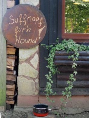 Hier kocht die Hüttenwirtin noch selbst und für Hunde gibt es Wasser im Napf. Wir bestellten dann ein Spezi und ein alkoholfreies Weizenbier. Dazu hatte Michael sich für Schweineschnitzel mit Waldpilzsoße, Pommes und Salatbeilage entschieden. Ich hatte eine Roulade mit Rotkohl und Klößen und dazu ganz viel Soße, die aber im Laufe des Essens vollständig von den Klößen aufgesaugt wurde. Alles sehr lecker.