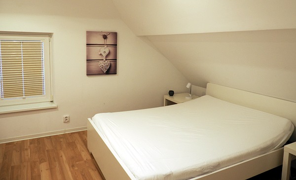 Oben befindet sich insgesamt neben dem Duschbad ein Flur mit Gaderobe, ein Schlafzimmer mit Doppelbett und ein kleines Kinderzimmer. Da die Treppe nicht gesichert werden kann, sollten die Kinder nicht zu klein sein oder sie müssen ständig beaufsichtigt werden.