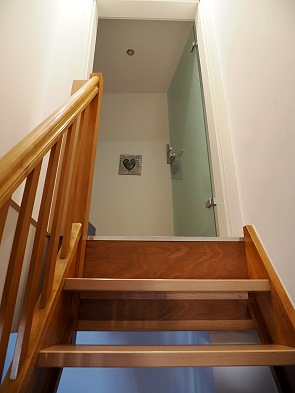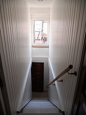 Die Tür zur Gasse war bei unserer Ankunft nicht abgeschlossen und im Schuppen konnten wir den Hausschlüssel mit einem Code entnehmen. Der Code wurde uns am selben Tag geschickt, da wir aber schon unterwegs waren und nicht mehr ins Mailprogramm schauten, haben wir ihn nach einem Anruf am Telefon bekommen. Vom Hof aus geht es hinter der Haustür erst einmal eine steile Treppe nach oben in einen kleinen Flur.