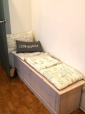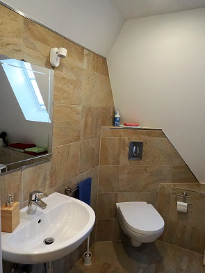 Menschen mit Blasenschwäche, denen die Dachschrägen nichts ausmachen, können auch oben schlafen und haben es somit nicht so weit. Der Zugang über die steile Holztreppe bleibt aber auch ihnen nicht erspart. Runter sind wir immer rückwärts gegangen, da fühlten wir uns sicherer.