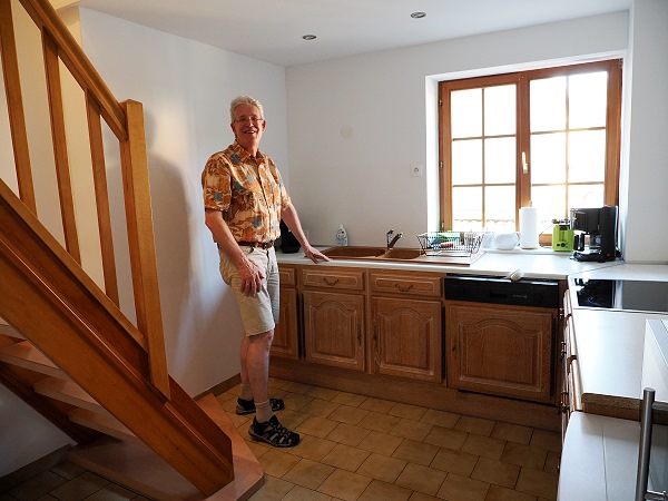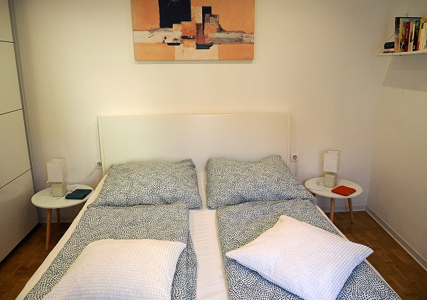 Direkt neben dem Wohnzimmer gibt es ein Schlafzimmer. Hier waren die Betten gemacht, denn es ist das schönste im Haus mit einem breiten Bett, Leselampen, Nachttischen und einem grossen Schrank. Ein weiteres Schlafzimmer befindet sich in der zweiten Etage, das hat allerdings Dachschrägen am Kopfende, was für Michael gar nicht geht. So schliefen wir hier unten, mussten dafür aber zu Toilette und Bad immer eine sehr steile Treppe von der Küche aus in die zweite Etage hoch.