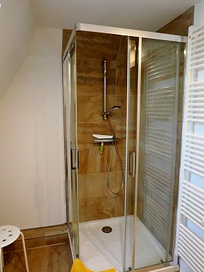 Das Bad ist sehr schön, mit gleichen Kacheln an Wänden und auf dem Boden. Es gibt eine geräumige Dusche und viel Abstellfläche. Natürlich auch einen Föhn, Pflegeprodukte und Handtücher.