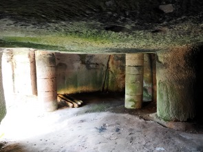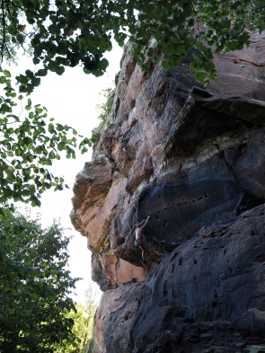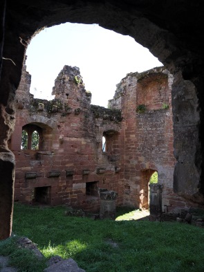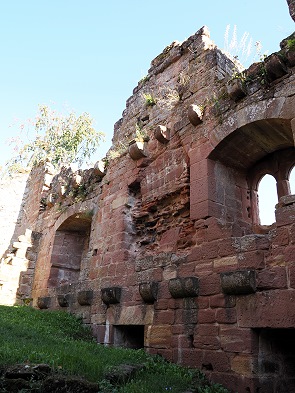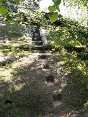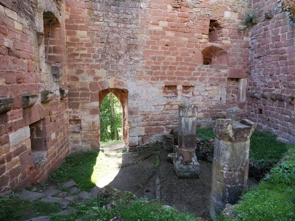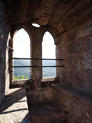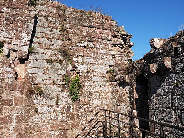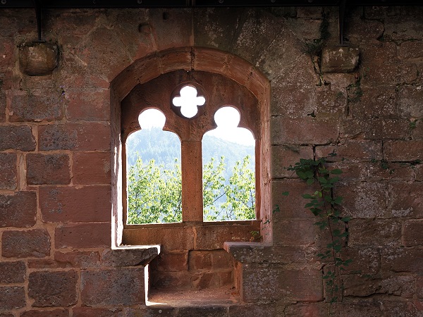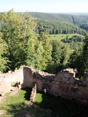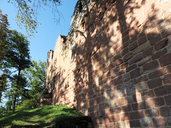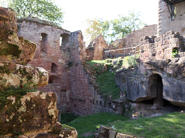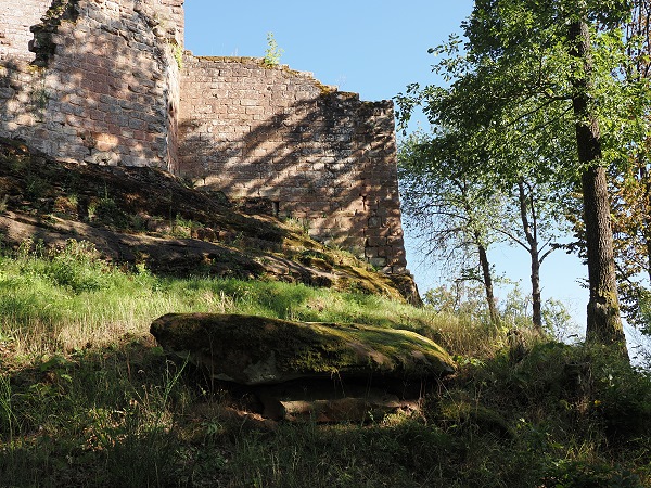 Von hier aus erreicht man zu Fuß gleich zwei Burgruinen. Einmal nach 10 Minuten Château du Vieux-Windstein, also die Burgruine Altwindstein. Die besuchten wir zuerst, allerdings gab es für uns hier nicht so viel zu sehen. Die Südanlage, auch vordere Burg genannt, überragt ein heute nicht mehr zugänglicher, etwa 20 Meter hoher senkrechter Felsen. So kann man den vorderen Teil nur über einen unterirdischen Zugang als Felsschacht erklimmen.