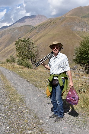 Da die Fenster noch offen standen war uns schnell klar: Alles Persönliche mussten wir mitnehmen, uns zu Fuß auf den Weg zur Hauptstraße machen und dort auf eine Mitfahrgelegenheit ins ca. 20 Kilometer entfernte Stepanzminda hoffen. Die Sonne brannte vom Himmel und wir liefen los: Mit einem ca. 8 Kilo schweren Fotorucksack mit 2 Kameras, 3 Ojektiven und dem Laptop, mit Stativ, unseren dickeren Jacken, Wasserflaschen und einigen Kleinigkeiten in Plastiktüten, die sonst noch so im Auto rumflogen. Zwei Stunden haben wir gebraucht um wieder runter zum Talboden zu kommen. Die Fahrt dort hinauf lohnt sich auf jeden Fall, denn die Ausblicke sind gigantisch. Wer mit Auto in der Region unterwegs ist sollte die Auffahrt nicht scheuen. Leider konnten wir es bergab schwer bepackt nicht mehr so sehr genießen.