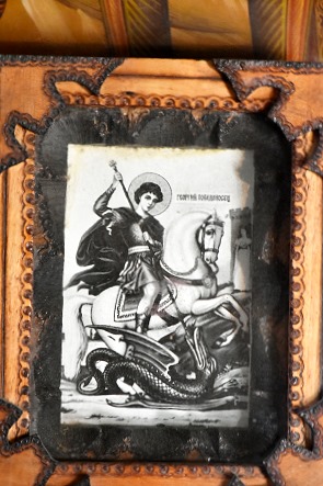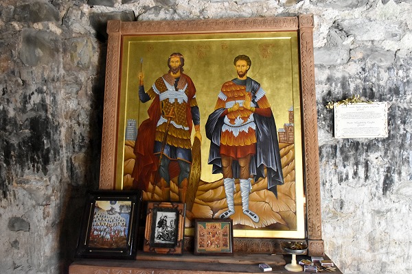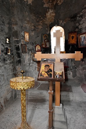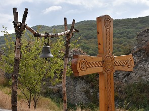 Oben in der Festung waren wir zuerst ganz alleine unterwegs. So konnten wir ganz in Ruhe Bilder machen und die kleine Kirche im Zentrum besichtigen. Die war zwar geöffnet, aber ein Priester war nicht zu sehen. Die Steindecke im Inneren ist scher verrußt, es gibt aber ein paar sehr schöne Ikonen hier. Vor der Jvari Patiosani Church, eher eine Kapelle, stehen ein Holzkreuz und ein Glockenturm mit einer Glocke.