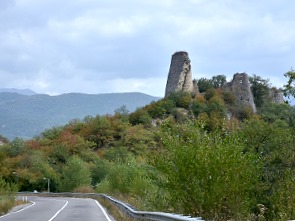 Danach wurde der Verkehr wieder dünner, denn wir hatten uns für eine Nebenstrecke entschieden. Die Regionalstraße 38 zweigt kurz nach der Stadtgrenze von Tbilisi bei Vaziani von der 5 ab und führt über die Berge 70 Kilometer direkt nach Telawi. Diese Strecke ist deutlich kürzer als andere, jedoch wegen der vielen Kurven kaum schneller. Da man hier auch den 1.620 Meter hohen Gomboripass überqueren muss, wird die Strecke von Lastwagen weitgehend gemieden. Wir sahen Kuherden und Schafe mit Hirten auf der Straße. Am Straßenrand standen meist ältere Männer, die Honig verkauften.