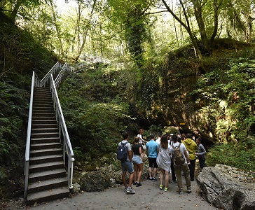Nachdem wir den Eintritt bezahlt hatten und die meisten noch mal schnell auf der Toilette waren, ging die Führung los. Erstmal kommt eine Freitreppe hinunter in ein Karstloch, in dem sich unten der eigentliche Eingang zur Höhle befindet. Die große Gruppe wurde vor dem Höhleneingang aufgeteilt: Englisch und Russisch. In der englischsprachigen Gruppe waren wesentlich weniger Teilnehmer.