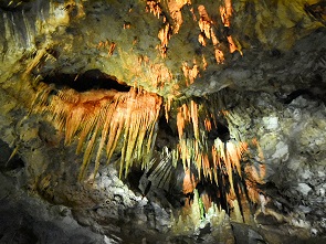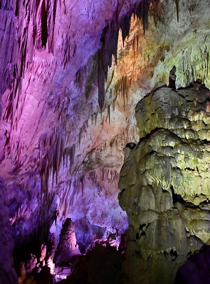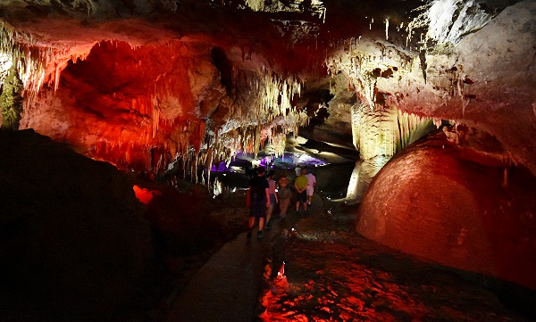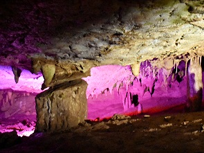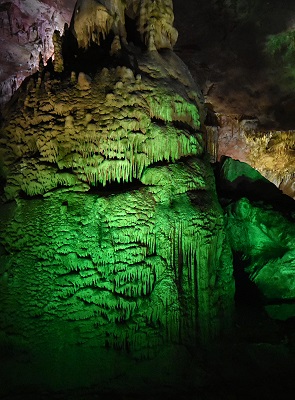 Die Führung folgt 1.420 Meter den betonierten Pfaden mit rund 800 Treppenstufen in südwestlicher Richtung. Gezeigt werden ca. 15 Hallen, die höchste Decke ist 21 Meter hoch. 14°C ist es hier unten permanent, eine Jacke ist somit nicht verkehrt, und schon der erste Saal, die Kolkheti Hall ist viel größer als viele andere Höhlen. Ab hier erschallt ruhige klassische Musik, die uns den ganzen Weg lang begleitet. Vivaldi und bunte Lichter als Untermalung beim Bestaunen von versteinerten Wasserfällen, Tropfsteinwänden und Zapfen an der Höhlendecke. Die Tropfsteine werden wechselnden Farben bestrahlt, wenn einem Rot nicht gefällt, dann wartet man eine Weile und das Ganze wird Blau. Das war schon ziemlich beeindruckend und wir hatten es als wesentlich kitschiger erwartet.