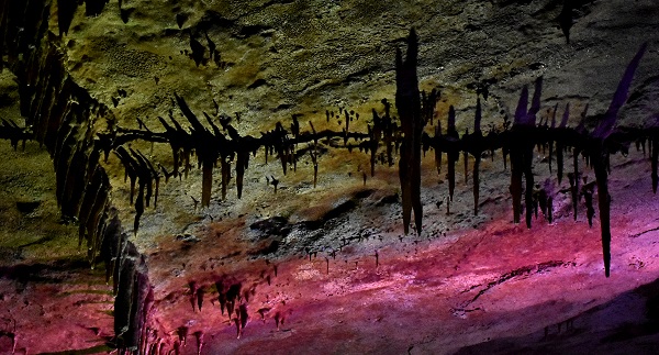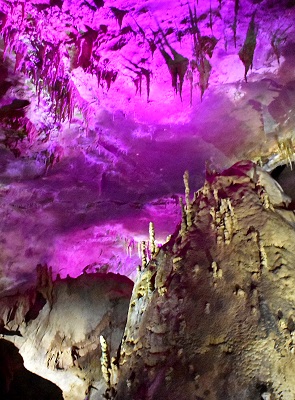 Zuerst steigt man hinter dem Eingang noch zahlreiche Treppenstufen hinunter ins Höhlensystem, die durch die überall durchdringende Feuchtigkeit stellenweise schlüpfrig sind. Wir wussten im Vorfeld, dass hier mit bunter Beleuchtung gearbeitet wird, was bei in den meisten Ländern eher verpönt ist, weil nicht naturnah. Wir waren uns nicht sicher, ob uns das gefällt. Aber es ist sehr gut gemacht, hier wird mit LED Licht gearbeitet, von der deutschen Firma Cavelighting installiert.