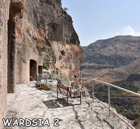 Die Treppen in Wardsia zu erklimmen ist ziemlich kraftraubend, man läuft auch lange Zeit auf Balkonen und Galerien mitten auf der Felswand in praller Sonne herum. Die wohl am meisten fotografierte Felswand ist etwa 500 Meter hoch und das Erklettern der in Stein gehauenen Treppen über die noch sichtbaren 8 Etagen erfordert eine gute Kondition. Die Wege sind gut zu begehen und mit Geländern überall gesichert. Wer Höhenangst hat oder unsicher ist kann sich festhalten.