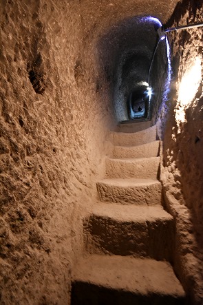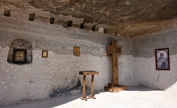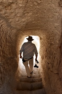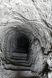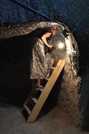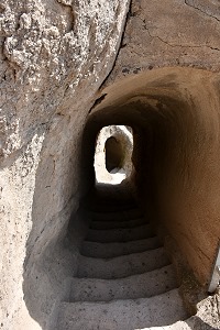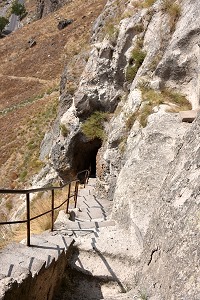 Völlig unbefangen hatten wir eine der tief im Berg liegenden Quellen besichigt und danche die kleine Kapelle hinter der Hauptkirche erreicht. Dort gab es in einer Ecke ein Loch halb in der Wand und halb in der Decke, und eine kleine Holztreppe mit drei Stufen führte dort hinauf. Hier darf man keine Angst vor Enge haben, die Stufen in den folgenden Felstunneln sind alle ungleichmäßig, die Luft etwas stickig und die Wände nah. Wenn mittags die Sonne auf die Felsen scheint, dann haben die Höhlen ein sehr angenehmes Raumklima und man ist froh über den Schatten. Selbst in der Mittagshitze ist es im Inneren sehr angenehm, zum Teil sogar schon schwülwarm.