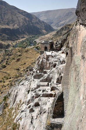 Ganz in der Nähe von Wardsia befinden sich noch weitere ausgedehnte Höhlensysteme wie Wanis Kwabebi, die Wani-Höhlen, etwa 3 km nordöstlich von Wardsia auf einer Höhe von 1.386 Metern. Diese Anlage bietet mehr als 200 Höhlen auf 16 verschiedenen Ebenen, die ebefalls untereinander durch Tunnel verbunden sind. Dort ist gar nichts gesichert und es leben auch Mönche in der Anlage, so dass sie eher ein Ort der Andacht ist. Fotografieren ist hier nicht gerne gesehen. Eigentlich wollten wir die Wani Höhlen am Nachmittag besuchen, aber der Rauch der Feuer hatte sich mittlerweile im ganzen Tal verteilt und die Atemluft und Sicht waren nicht gut. Wir waren froh, dass wir Wardsia schon früh am Morgen besucht hatten.