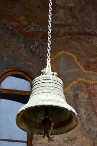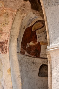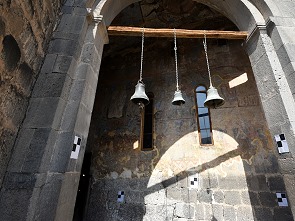 Da wir nicht in einer Gruppe unterwegs waren haben wir hier den richtigen Ausgang nicht gefunden und sind die Treppe im Berg wieder zurück geklettert. Ein Grund war auch, dass wir die Hauptattraktion, die Klosterkirche zur Himmelfahrt mit einem prächtigen Säulenportal, mangels Führung vorher ausgelassen hatten. Und diese Kirche wollten wir auf jeden Fall noch sehen. Die drei Glocken sind schon von unten zu sehen, so kann man immer bestimmen wo sich die Kirche befindet. Es gibt einen großen Saal in Form eines Tonnengewölbes, Apsis und Narthex. Er ist mit farbigen Fresken ausgemalt. Von besonderer Bedeutung sind die Wandmalereien in der Hauptkirche von Wardsia. Sie enstanden zwischen 1184 und 1186 zur Gründung des Klosters, man sieht hier Darstellungen vom Erbauer König Giorgi III. und Königin Tamar als noch unverheiratete Frau. Dies ist das einzige Bildnis von Königin Tamar in Georgien. Diese Epoche markiert den Höhepunkt der mittelalterlichen georgischen Wandmalerei, die sich stark von der zeitgenössischen byzantinischen Art unterschied. Leider war bei unserem Besuch ein Gerüst davor, denn die Fresken wurden gerade restauriert.