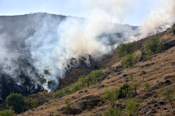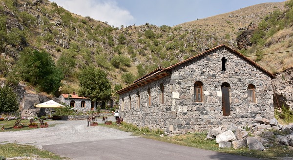 Nach dem doch ziemlich anstrengenden Besuch der Höhlen wollten wir noch das ausgeschilderte Nonnenkloster besuchen. Zu diesem gelangt man, wenn man an der Brücke über den Mtekwi nicht nach rechts zur Höhlenstadt abbiegt, sonder nach links weiter dem Tal folgt. Nach einer Weile führt dann ein gut asphaltierter Abzweig rechts hinauf in den Berg in Richtung Kloster. Als wir dort ankamen, war zunächst niemand zu sehen. Dann kam eine Nonne heraus , stand im gepflegten Garten und schaute besorgt auf das Feuer in den Bergen oberhalb des Klosters. Dort brannte das trockene Gras in breiter Front ab und es gab eine heftige Rauchentwicklung, allerdings noch ziemlich weit vom Kloster entfernt. Wir beschlossen, zum Vardzia Resort zurück zu fahren, um uns von der anstrengenden Kletterei im Hotel ein wenig auszuruhen.