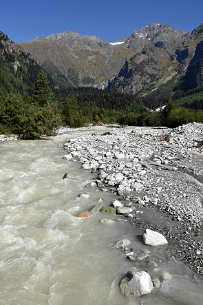 Zahlreiche Flussläufe, herabstürzende Wasserfälle, grandiose Aussichten und nicht zuletzt der Blick auf mehrere Viertausender sind die Highlights, die diese Tagestour bietet. Vor allem, wenn man so herrliches Wetter hat wie wir an diesem Tag. Eigentlich war es schon zu heiß, die Sonne brannte vom blauen Himmel.