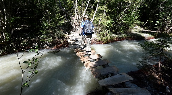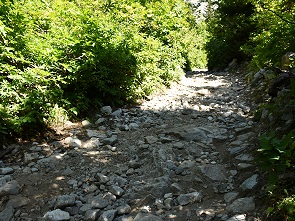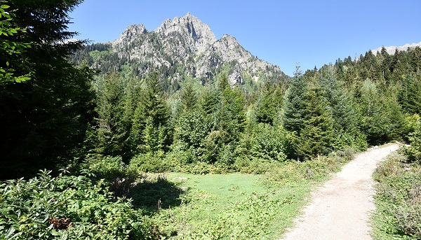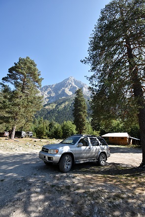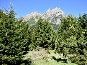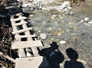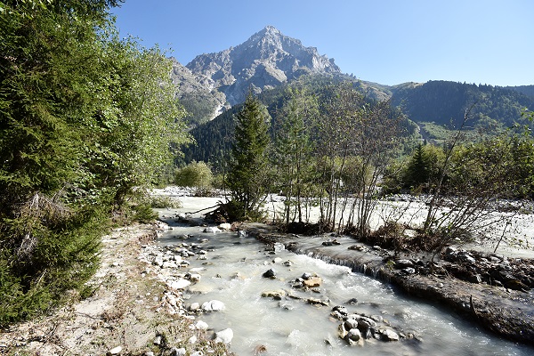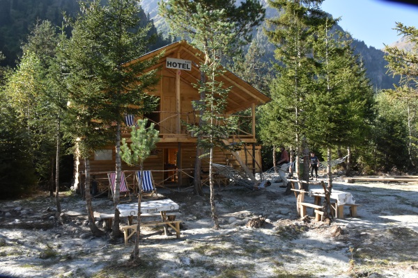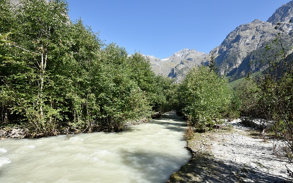 Hier auf 1.700 m über dem Meeresspiegel überquert man auf einer provisorischen Brücke den rechten Zufluss der Dolra. Links liegt der schneebedeckte Berg Cherinda (3580m). Von hier aus beginnt nun der Aufstieg und der Wanderweg führt in den Nadelwald hinein. Ein Stück des Weges wurde vor einiger Zeit vom Wasser weggespült, dort gibt es jetzt einen kleinen Umweg und wir mussten ein sehr steiles Stück rutschige Erde am Flußufer hochklettern. Dahinter war der Weg aber immer gut markiert, verlaufen kann man sich nicht.