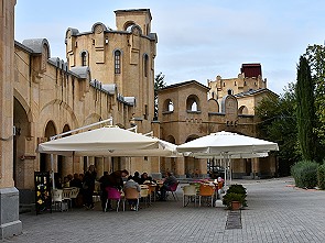 Dazu am Eingang direkt an der riesigen Freitreppe einen freistehenden Glockenturm mit vielen Glocken, weiter oben Bänke und einen schönen Garten. Leider waren die Wasserbecken nicht gefüllt. Neben dem Eingang gibt es auch ein gemütliches Café namens Lagitze Waters, wo man leckere Acharuli Khachapuri, Limonaden und Kaffee bekommt.