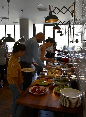Dazu kann man wählen zwischen Kaffee, allerlei Teesorten, frischen Säften, Früchten, Joghurt und Müsli. Es gibt verschiedene Sorten Aufschnitt und Käse, sogar frisch aufgeschnittener Kernschinken liegt an einer professionellen Schneidemaschine im Retro-Look. Man findet Marmelade, Honig und sogar frische Honigwaben.