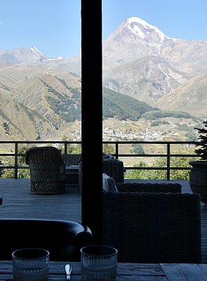 Die beiden Stardesignerinnen Nata Jamberidze und Keti Toloraia aus Tbilisi haben ganze Arbeit geleistet: Mit direktem Blick auf die kaukasischen Gebirgszüge, mit dem 5.033 Meter hohen Kazbegi als Krönung und auf einem Berg davor die Umrisse der Gergeti Trinity Church. Hier schaut man hier direkt und unverbaut auf DAS Postkartenmotiv von Georgien, einer der besten Aussichten, die man für Geld mieten kann. Sicher, es gibt unten im Ort auch einfache Gästehäuser, aber das Rooms ist das einzige Hotel vor Ort und schon auf Grund seiner Lage "the place to be".