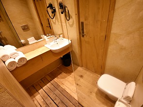 Das Badezimmer ist recht eng, die Tür kann man nicht öffnen, wenn die Toilette besetzt ist. Es gibt viel Ablagefläche rund um das Waschbecken und eine Dusche mit großem Duschkopf. Ob es eine gute Idee war, den gesamten Boden hier ebenfalls mit Holzlamellen zu belegen, inklusive der Dusche? Denen sieht man im Duschbereich nämlich schon an, dass das Wasser hier wohl nicht so gut abfließt und trocknet, trotz gut funktionierender Lüftung.