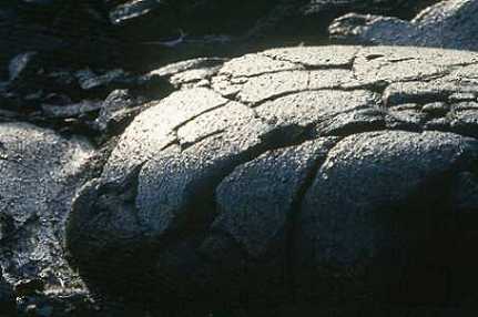 Manchmal ist es schwer, die Art der Lava eines älteren Lavastroms zu erkennen. Ist die Oberfläche schön glatt, oder sieht das Lavafeld aus wie eine Mondlanschaft aus zerbrochenem Geröll, dann ist die Sache klar. Aber nach einger Zeit verwittert die Pahoe´hoe Lava, die oberste Schicht platzt ab und hinterlässt eine rauhe Oberfläche. Oder ein Feld aus frischer Pahoe´hoe Lava ist an der Oberfläche gerade erkaltet, da schiebt sich im Untergrund frische Lava nach. Dann bilden sich überall Hügel und Täler, und die oberste Schicht zerbricht zu großen, scharfkantigen Platten wie Eisschollen, nur in schwarz.