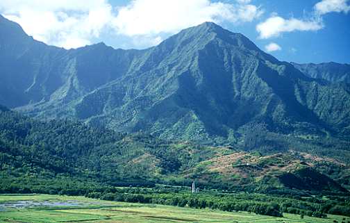 Wenn man vom Kilauea Point weiter in Richtung Norden fährt dann kommt man zwangsläufig an einem Aussichtspunkt vorbei, der auf der linken Straßenseite liegt. Der kleine Parkplatz ist mit dem offiziellen Schild des Hawaiian Visitor Bureau gekennzeichnet. Von hier hat man einen schönen Blick auf das friedliche Hanalei Valley, vor allem bei gutem Wetter ist die Kulisse atemberaubend. Die tiefgrünen Berge im Hintergrund sind leider sehr oft in Wolken, vor allem am Nachmittag. Deshalb sollte man zum Fotografieren am besten so früh wie möglich hier vorbeikommen. Sind die Berge frei, dann erkennt man in den weit entfernten Abhängen zahlreiche Wasserfälle, die sich silbern ins Tal stürzen.