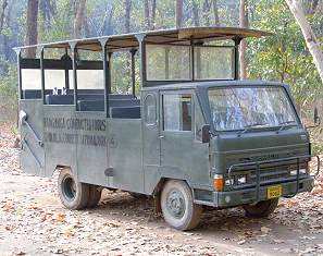 Um auf eigene Faust in das Hauptgebiet Dhikala des Corbett National Park zu gelangen, muss man eine Nacht in einem der fünf Camps buchen und bekommt nur dann ein Permit. So kann man mit dem eigenen Auto zum Camp fahren und unterwegs dabei nebenbei eine Safari auf eigene Faust machen, denn der Hauptweg ist gut ausgebaut. Leider haben wir das nicht gewusst, also waren wir auf eine organisierte Tour angewiesen. Die wird hier vom Forest Departement betrieben und wir hatten auf einen Jeep gegen Aufpreis gehofft. Aber es gibt nur Canter, die angeblich 15-sitzig sind. Aber 16-20 Leute inklusive Kinder quetscht man hier gerne rein in die offenen Busse.
