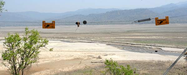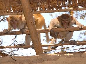 Als der Canter endlich im Camp stoppte, strecken wir erschöpft unsere durchgerüttelte Knochen. Dann mussten natürlich alle auf Toilette und wir durften die dreckigsten Klos aller drei Indienreisen bestaunen. Selbst die Inder unserer Reisegruppe kamen schaudernd und kopfschütelnd wieder raus. Unmöglich, denn hier kommen täglich mindestens zwei vollbesetzte Canter an. Auch das Camp machte keinen sehr gepflegten Eindruck. Wir zogen uns in ein abgelegenes Gebäude zurück, in dem alte Korbstühle für die Ausgestaltung abendlicher Barbequeues vor sich hinrotteten. Hier wollten wir in Ruhe unser Lunchpacket verspeisen, kamen aber kaum dazu etwas zu essen. Eine Affenhorde war sehr aufdringlich und die Tiere witterten das Essen. Die Situation wurde richtig brenzlig, als sie sich auch mit Steinen und Gebrüll kaum vertreiben ließen flohen wir in Richtung Lodge. Die Aussicht auf die Ebene war hier teilweise von Drähten und Zäunen versperrt und das Ambiente erinnert eher an ein Militärlager als an Urlaub - auch wenn die Umzäunung wegen der Elefanten und Tiger angemessen ist.