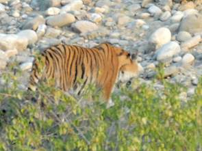 Schon kurz hinter dem Haupteingang lernten wir gleich alle Nachteile einer Cantersafari kennen. Denn im Flussbett rechts, etwa 200 Meter hinter dem Eingang, sahen wir gleich zwei Tiger. Gott-sei-Dank saßen wir auf der richtigen Seite und ich konnte in den paar Sekunden wenigstens noch ein paar Bilder von einem der beiden machen. Die anderen hatten wenig Chancen, denn durch das extrem laute Gekreische - "Tiger - TIGER - TIIIIGERRR" - der versammelten Horde waren die beiden Katzen im Nu aufgeschreckt und verschwanden im Busch. Das kleine Mädchen neben uns hatte den Tiger gar nicht gesehen und war von den Eltern gar nicht zu beruhigen. Die kleine Prinzessin war entschlossen, den Rest der Fahrt zu kreischen und lautstark ihren Unmut über die Ungerechtigkeit der Welt zum Ausdruck zu bringen, was nach einigen Stunden extrem nervte. Auch ein Blick auf den Tiger in meiner Kamera konnte sie nicht beruhigen.