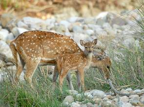 Die Unterkunft ist wunderschön gelegen am Rande des breiten Patli Dun-Tals, welches hier vom Ramganga-Fluss in zahlreichen Kanälen durchzogen wird. Dhikala bietet einen schönen Panoramablick auf die umliegenden Grasebenen, mit dem Höhenzug des Kanda im Hintergrund. Hier sahen wir auch unsere ersten und einzigen Elefanten, die wiederum laute Begeisterungsschreie auslösten, obwohl sie angekettet waren. Es handelte sich nicht um wilde Exemplare, sondern um die Reitelefanten des Camps.