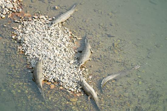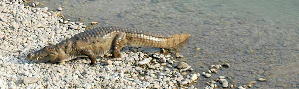 Die sehr holperige Fahrt führte durch Wald und dann am Ramganga River entlang. Um es kurz zu machen: das alte, klapprige Gefährt ohne nennenswerte Federung raste den Umständen entsprechend durch die Landschaft und alle Tiere waren verschwunden. Viel sahen wir nicht, ein paar scheue Rehlein, ein paar Pfaue und an einem schönen Aussichtspunkt hoch über dem Fluss hatten wir Ausblick auf Krokodile tief unter uns. Überhall, wo wir hielten, wurde die Begeisterung der Gruppe so laut, dass alle Tiere panisch flohen. Zweimal konnten wir aussteigen und die Krokodile im Fluss beim Sonnenbad auf einer Sandbank beobachten. Neben den Sumpfkrokodilen lagen auch die auch die seltenen, langschnäuzigen Gaviale. Dieser einzige heute lebende Vertreter seiner Art, der Gangesgavial (Gavialis gangeticus), lebt ausschließlich in den Flüssen des nördlichen indischen Subkontinents. Dies war der Höhepunkt der Safari - da sich Krokodile in ihrem Phlegma durch plappernde Horden zum Glück nicht irritieren lassen. Dann wurden wir weiter ein wenig durchgeschüttelt, bis wir das Camp Dhikala erreichten.