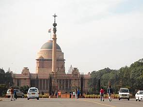 Eines der größten und prächtigsten Bauwerke im sorgfältig geplanten Viertel ist der Rashtrapati Bhavan, die offizielle Residenz des indischen Präsidenten. Es liegt oben auf dem am sanft abfallenden Hang des Raisina Hill, auf einer Grundfläche von mehr als 20.000 Quadratmeter befindet sich daneben das Parlamentsgebäude, bekannt als Sansad Bhavan. Von hier oben hat man einen schönen Blick auf eine überraschend verkehrsarme, schnurgerade breite Strasse bis hin zum India Gate. Bekannt ist auch der weitläufige Mogulgarten direkt am Rashtrapati Bhavan, der für die Öffentlichkeit aber nur von Februar bis März geöffnet ist.