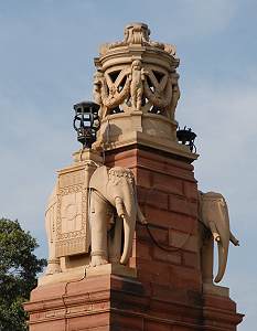 Das 42 Meter hohe, mächtige India Gate ist eines der bekanntesten Wahrzeichen von Neu-Delhi. Es wurde 1921 von Lutyens entworfen, der sich dafür augenscheinlich vom Arc de Trimphe in Paris inspirieren ließ. Die Bilder auf dieser Seite entstanden aus dem fahrenden Auto, wir sind hier nicht ausgestiegen, denn viel zu sehen gibt es nicht und anhalten ist problematisch. Inschriften am Tor erinnern an die gefallenen indischen Soldaten, die im 1. Weltkrieg für Großbritannien starben. Auch die Soldaten, die 1919 im Krieg in Afghanistan und 1971 im Krieg zwischen Indien und Pakistan ihr Leben ließen werden hier geehrt. Offiziell heißt es "All India War Memorial", aber India Gate ist im Sprachgebrauch wesentlich geläufiger.